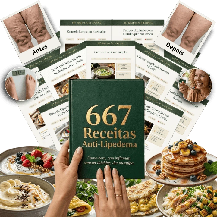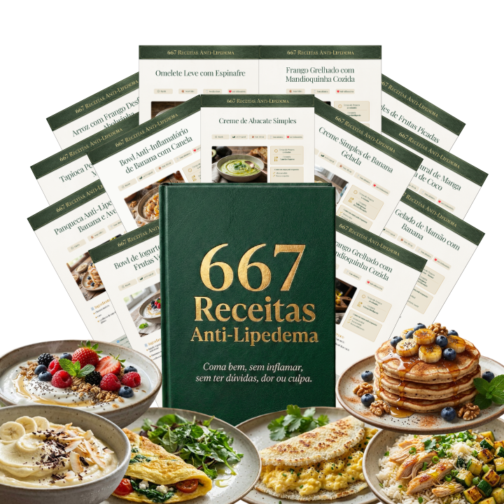 É uma ferramenta alimentar com 667 refeições pensadas para o corpo de quem tem Lipedema, para você comer com segurança, reduzir o inchaço e parar de se sentir culpada toda vez que senta à mesa.